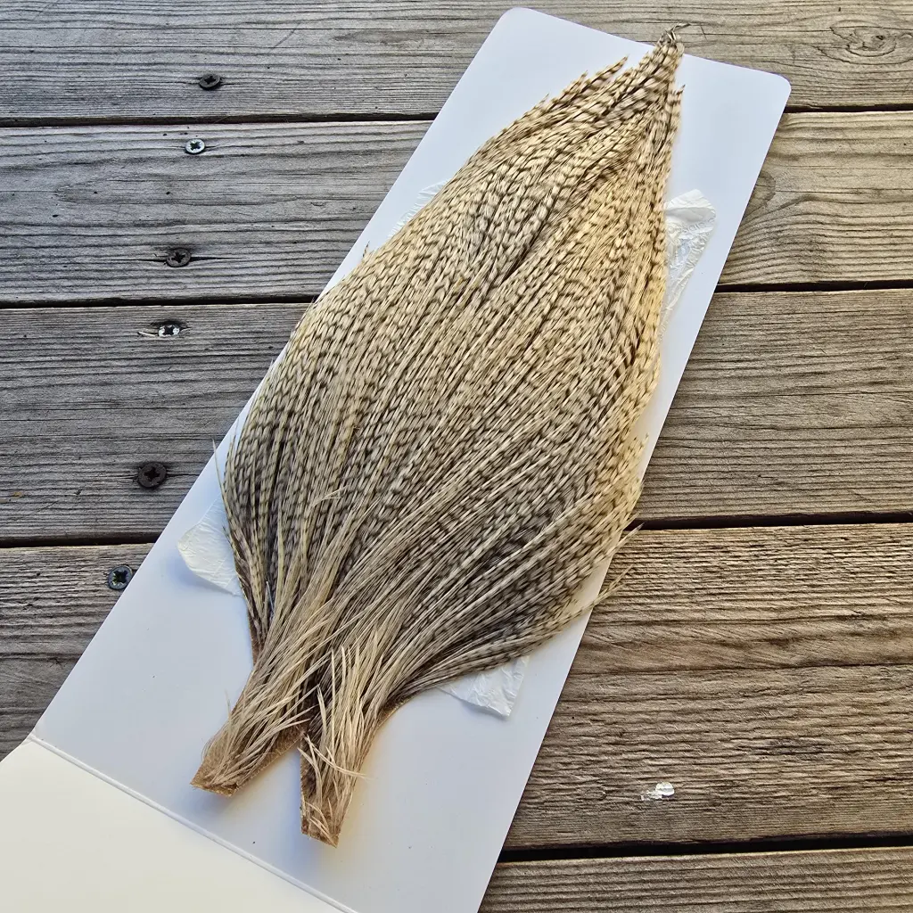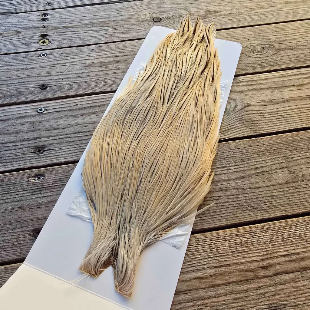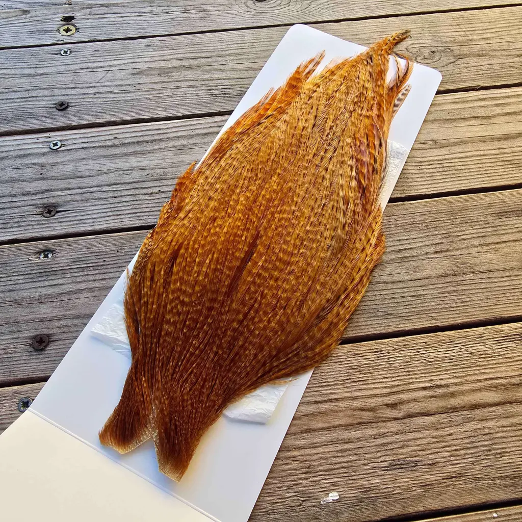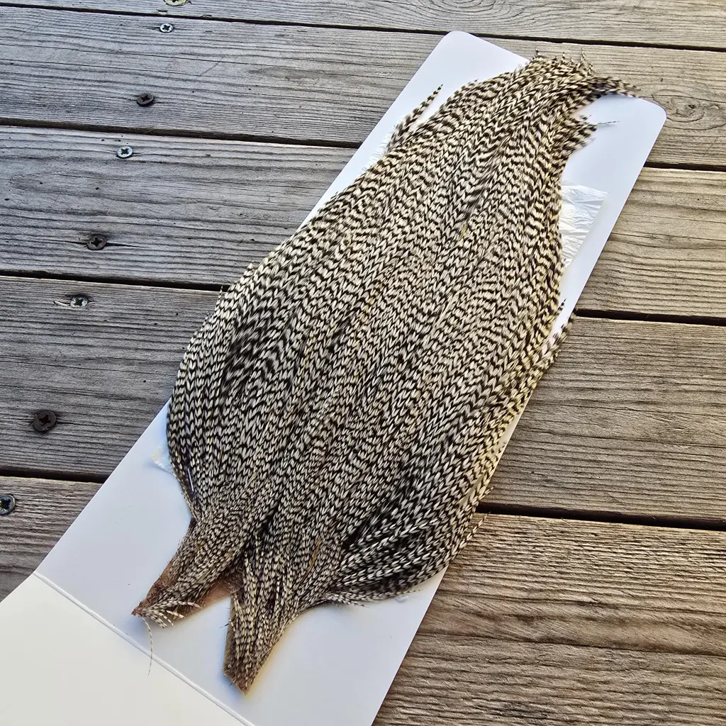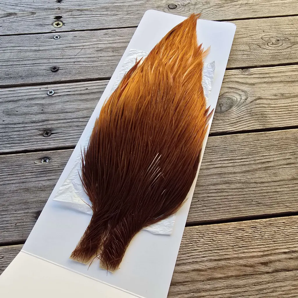 Top-quality cock capes from Ewing Feather Birds, renowned for producing some of the finest genetic dry fly hackle available. The Ewing Dry Fly Top Cape is a unique offering that combines exceptional feather density, uniform barb stiffness, and an impressive range of hackle sizes — capable of tying from size 4 right down to size 20.