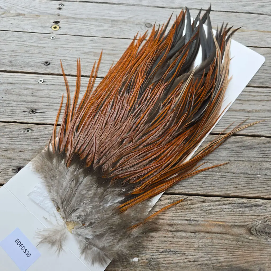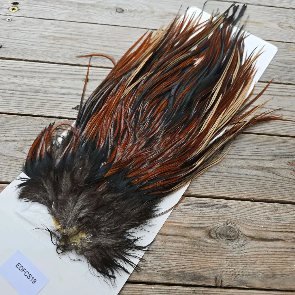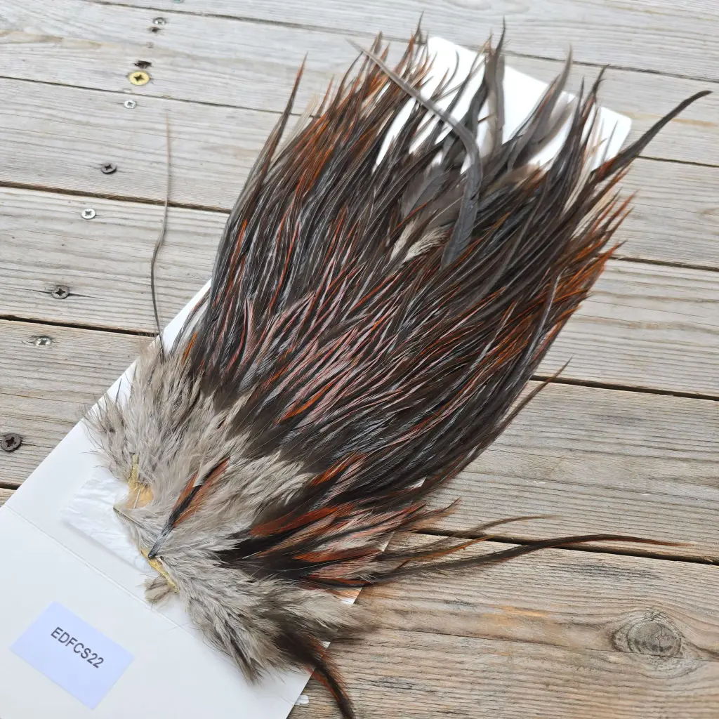 The Ewing Dry Fly Cock Full Saddle – Variant is a perfect example of nature’s happy accidents. These variant saddles come from roosters that have “gotten in with the wrong hens,” resulting in beautiful and unpredictable mixes of colour and pattern across the feathers.