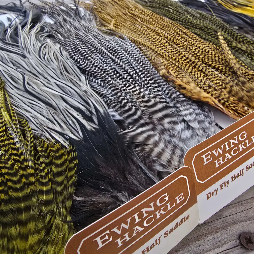 Ewing saddles are well regarded by fly tiers for their durability, natural sheen, and ease of use, allowing you to wrap clean, balanced hackles every time. A reliable choice for tiers looking for quality hackle for medium-sized dry flies.