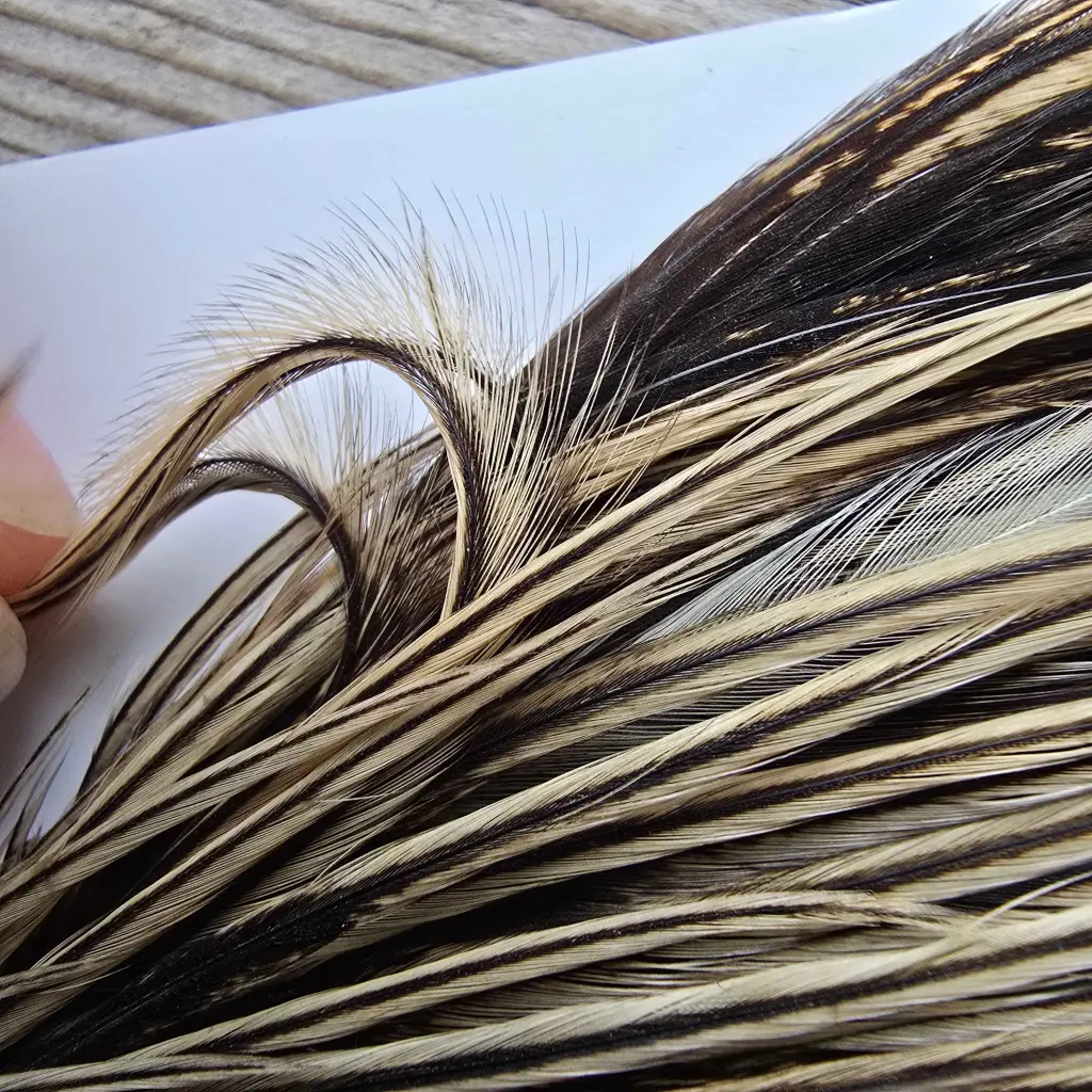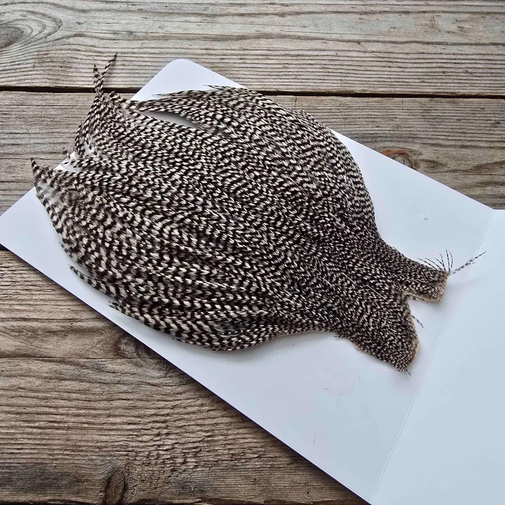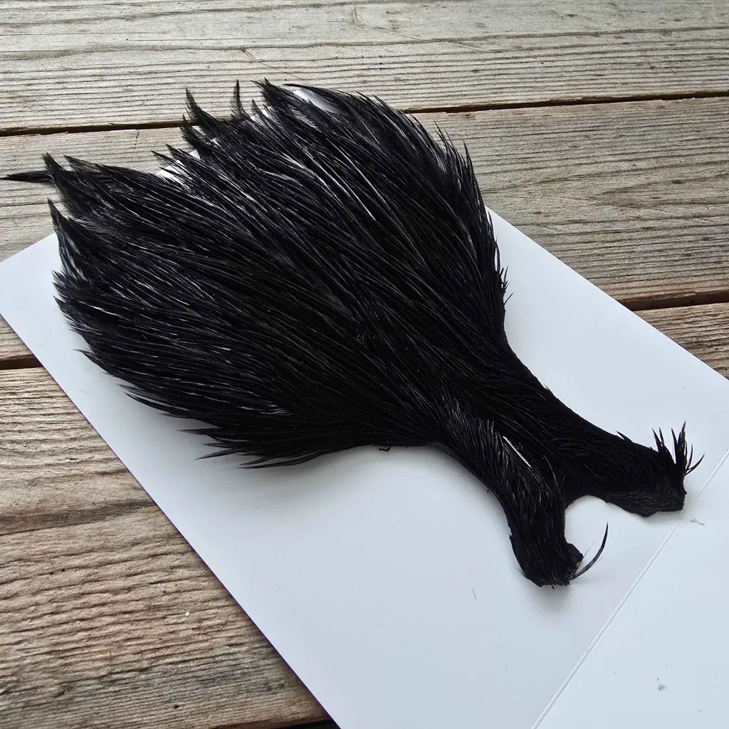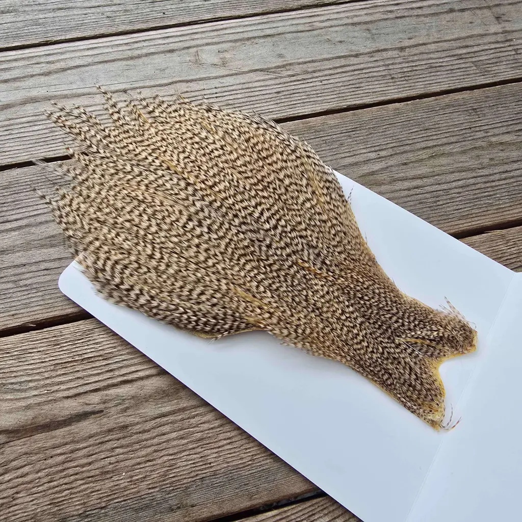 The top half of the cape contains the premium dry fly hackle, offering a superb range of sizes from #10 down to #18 and smaller. Each feather has the ideal combination of stiffness and taper, ensuring excellent flotation and a natural, balanced profile on the water.