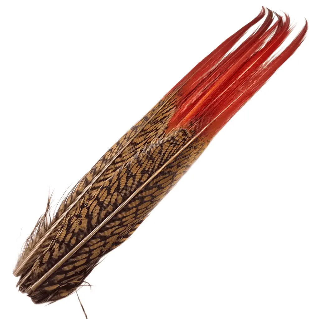 Veniards' golden pheasant red spears are a great addition to salmon prawn or shrimp patterns, especially for use as feelers. These spears boast bright, translucent red tips that glint beautifully in the sunlight, adding eye-catching detail to any fly.